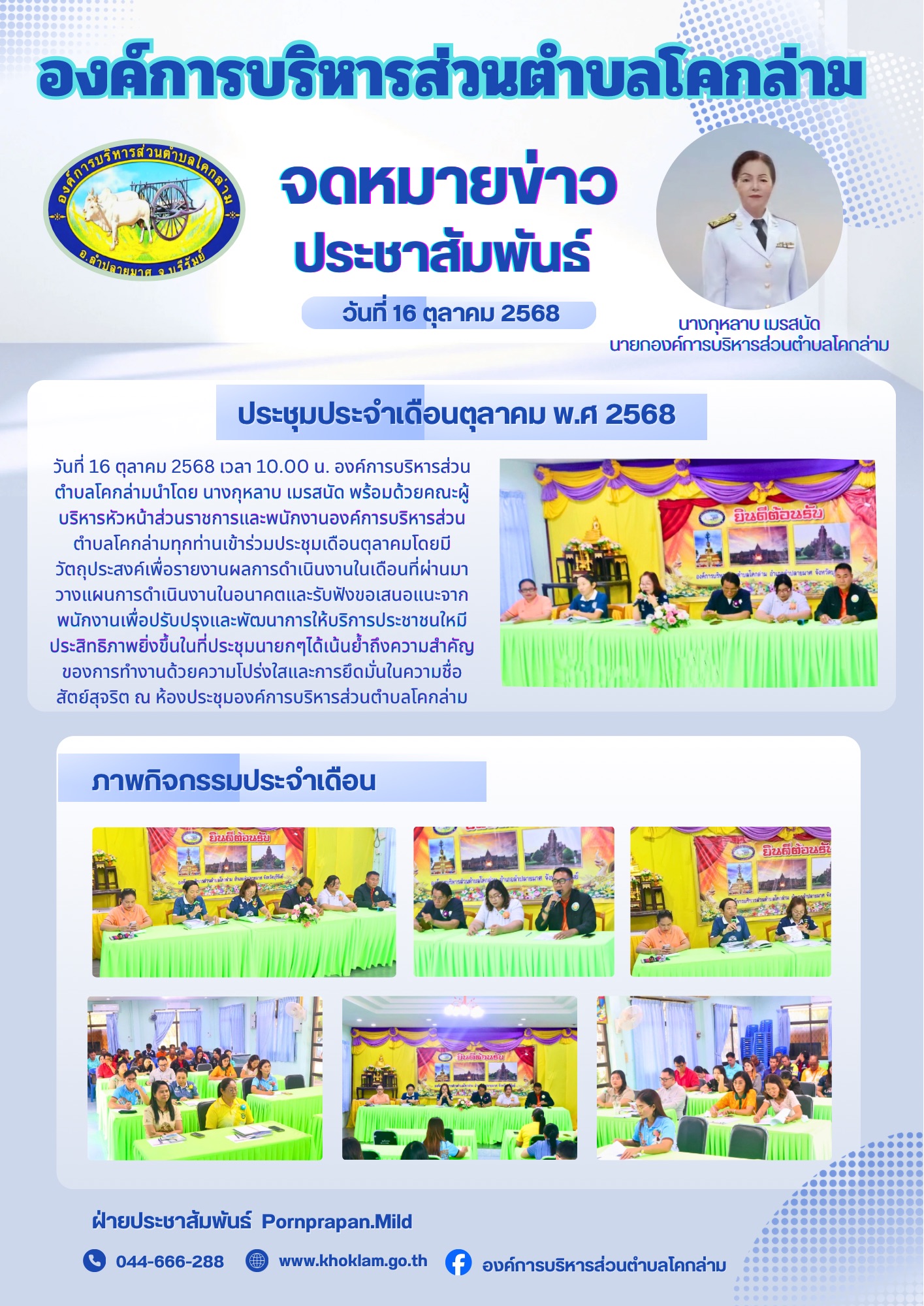 วันที่ 16 ตุลาคม 2568 เวลา 10.00 น. องค์การบริหารส่วนตำบลโคกล่ามนำโดย นางกุหลาบ เมรสนัด พร้อมด้วยคณะผู้บริหารหัวหน้าส่วนราชการและพนักงานองค์การบริหารส่วนตำบลโคกล่ามทุกท่านเข้าร่วมประชุมเดือนตุลาคมโดยมีวัตถุประสงค์เพื่อรายงานผลการดำเนินงานในเดือนที่ผ่านมาวางแผนการดำเนินงานในอนาคตและรับฟังขอเสนอแนะจากพนักงานเพื่อปรับปรุงและพัฒนาการให้บริการประชาชนใหมีประสิทธิภาพยิ่งขึ้นในที่ประชุมนายกๆได้เน้นย้ำถึงความสำคัญของการทำงานด้วยความโปร่งใสและการยึดมั่นในความชื่อสัตย์สุจริต ณ ห้องประชุมองค์การบริหารส่วนตำบลโคกล่าม