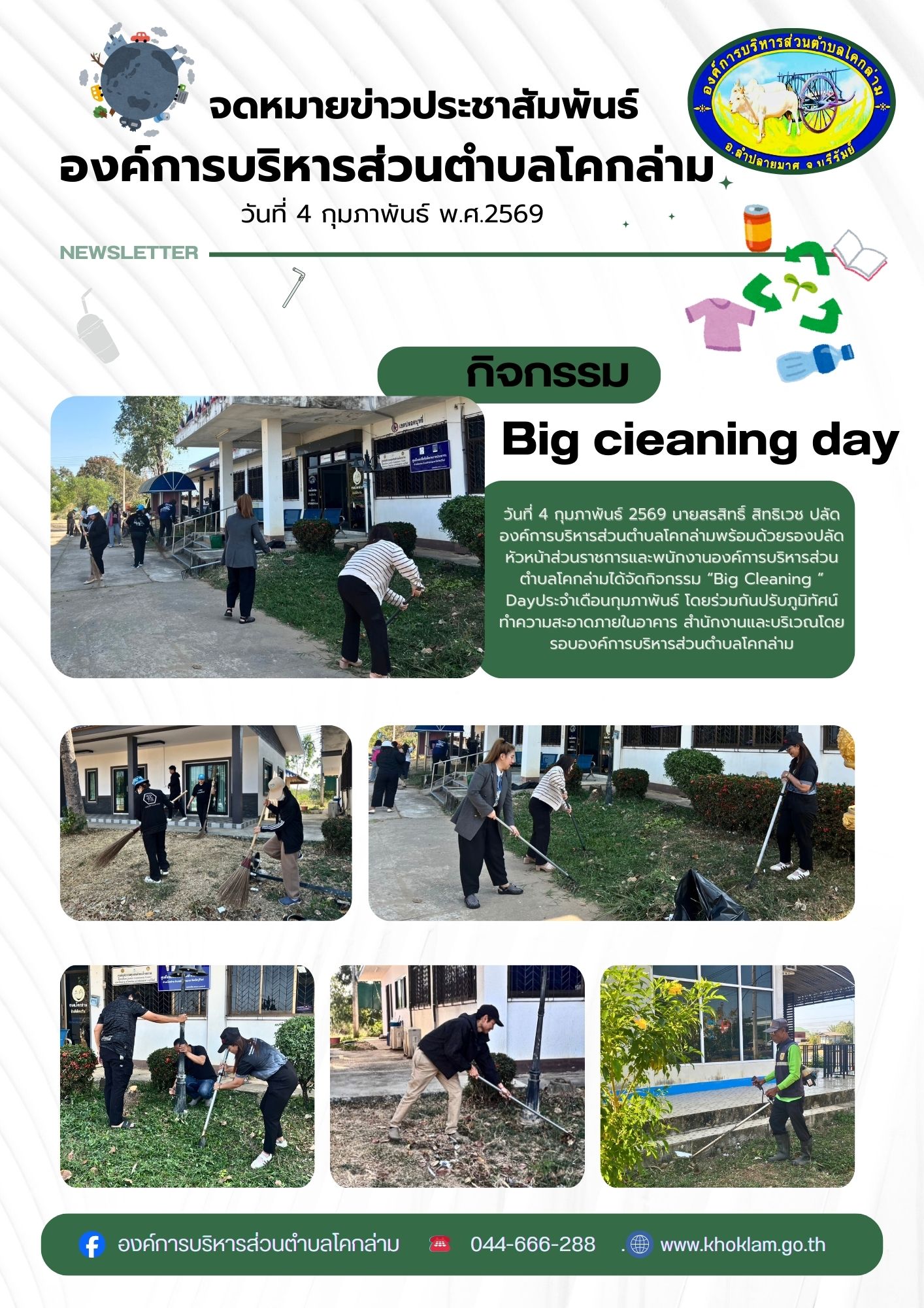 วันที่ 4 กุมภาพันธ์ พ.ศ 2569 องค์การบริหารส่วนตำบลโคก ล่ามโดย นายสรสิทธิ์ สิทธิเวช ปลัดองค์การบริหารส่วนตำบลโคก ล่าม พร้อมด้วยรองปลัดองค์การบริหารส่วนตำบลโคกล่าม หัวหน้า ส่วนราชการ ข้าราชการ พนักงานและเจ้าหน้าที่ อบต.โคกล่ามได้ร่วมกิจกรรม "Big Cleaning Day "ประจำเดือน กุมภาพันธ์ 2569โดยได้ทำความสะอาดบริเวณถนนทางเข้า อาคาร สำนักงานและบริเวณโดยรอบเขตพื้นที่องค์การบริหารส่วนตำบลโคกล่าม