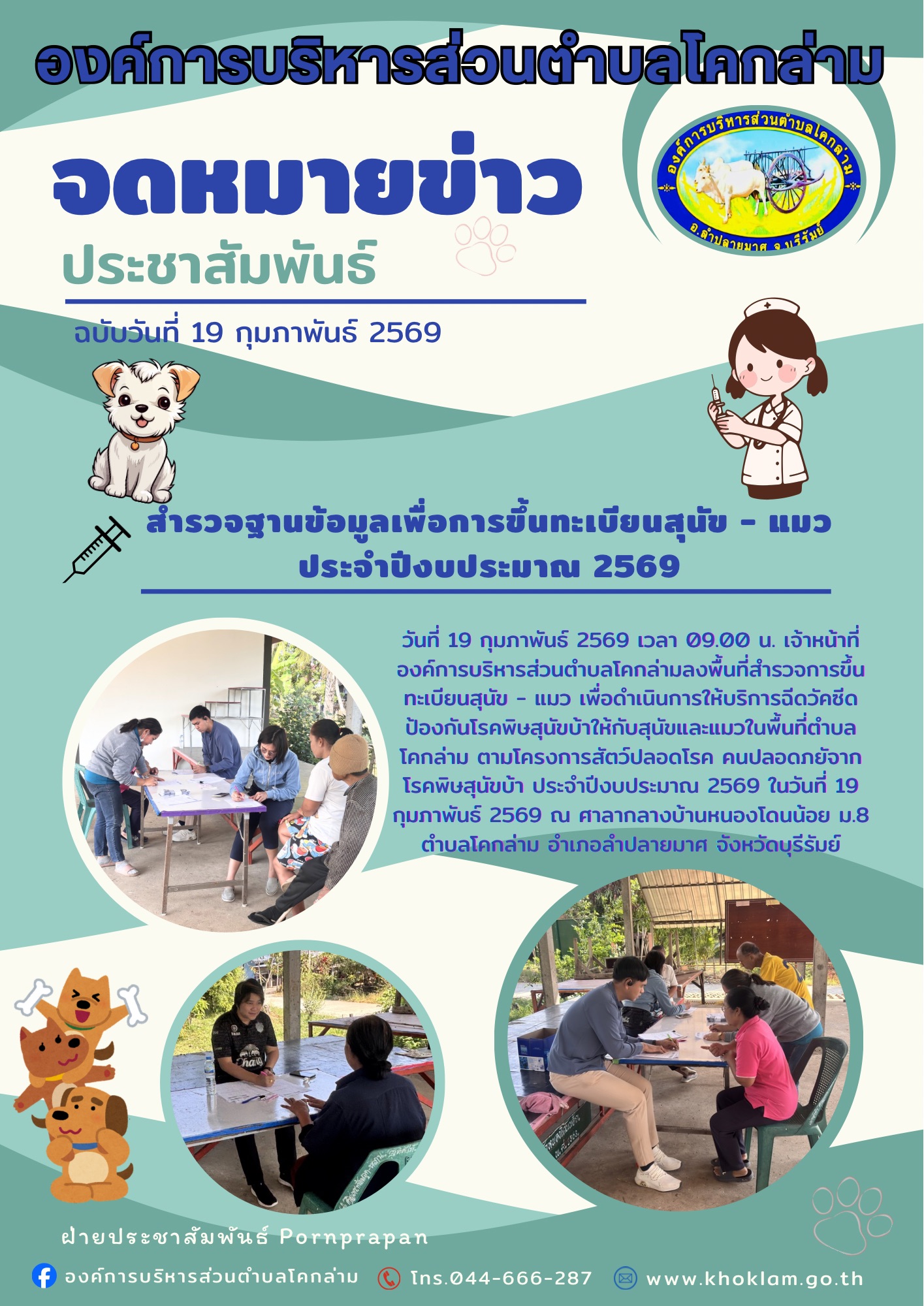 วันที่ 19 กุมภาพันธ์ 2569 เวลา 09.00 น. เจ้าหน้าที่องค์การบริหารส่วนตำบลโคกล่ามลงพื้นที่สำรวจการขึ้นทะเบียนสุนัข - แมวเพื่อดำเนินการให้บริการฉีดวัคซีดป้องกันโรคพิษสุนัขบ้าให้กับสุนัขและแมวในพื้นที่ตำบลโคกล่ามตามโครงการสัตว์ปลอดโรคคนปลอดภัยจากโรคพิษสุนัขบ้า ประจำปีงบประมาณ 2569 ในวันที่ 19 กุมภาพันธ์ 2569 ณ ศาลากลางบ้านหนองโดนน้อย ม.8 ตำบลโคกล่าม อำเภอลำปลายมาศ จังหวัดบุรีรัมย์