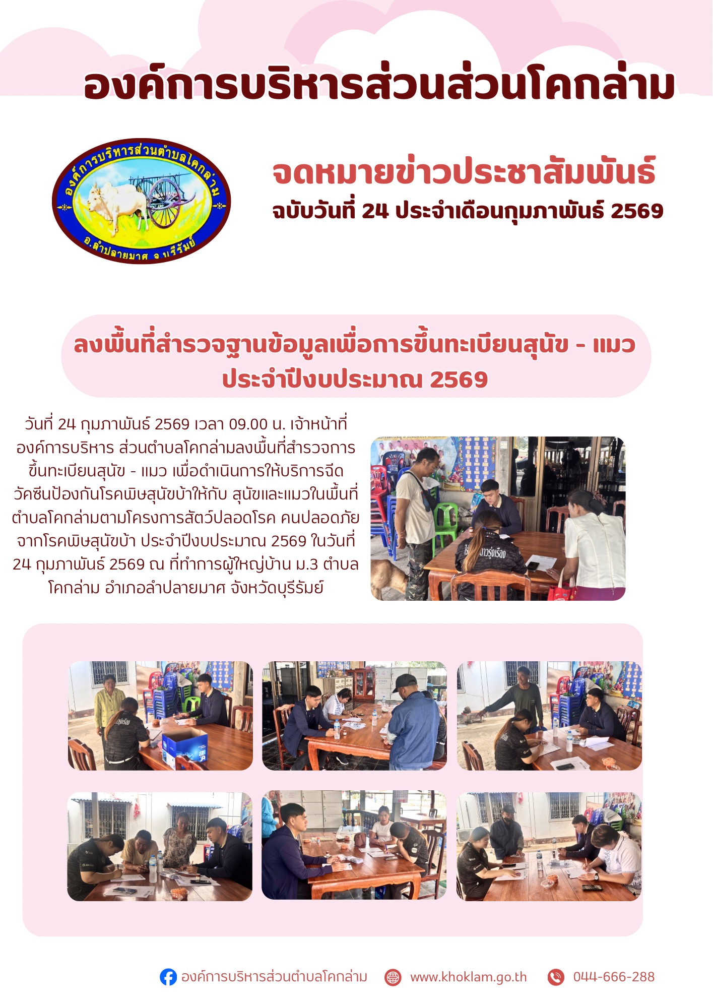 วันที่ 24 กุมภาพันธ์ 2569 เวลา 09.00 น. เจ้าหน้าที่องค์การบริหารส่วนตำบลโคกล่ามลงพื้นที่สำรวจการขึ้นทะเบียนสุนัข - แมว เพื่อดำเนินการให้บริการฉีดวัคซีนป้องกันโรคพิษสุนัขบ้าให้กับสุนัขและแมวในพื้นที่ตำบลโคกล่ามตามโครงการสัตว์ปลอดโรค คนปลอดภัยจากโรคพิษสุนัขบ้า ประจำปีงบประมาณ 2569 ในวันที่ 24 กุมภาพันธ์ 2569 ณ ที่ทำการผู้ใหญ่บ้านปิดทอง ม.3 ตำบลโคกล่ามอำเภอลำปลายมาศ จังหวัดบุรีรัมย์