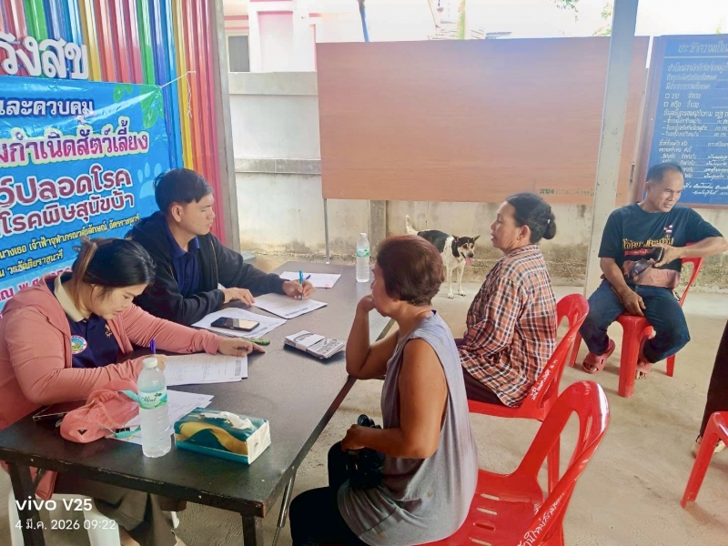 วันที่ 4 มีนาคม พ.ศ 2569 เวลา 09.00 น. เจ้าหน้าที่องค์การบริหารส่วนตำบลโคกล่าม ลงพื้นที่สำรวจการขึ้นทะเบียนสุนัข - แมว เพื่อดำเนินการให้บริการฉีดวัคซีนป้องกันโรคพิษสุนัขบ้าให้กับสุนัขและแมวในพื้นที่ตำบลโคกล่ามตามโครงการสัตว์ปลอดโรคคนปลอดภัยจากโรคพิษสุนัขบ้า ประจำปีงบประมาณ 2569 ในวันที่ 4 มีนาคม พ.ศ 2569 ณ ที่ทำการผู้ใหญ่บ้านใหม่สามัคคี ม.5 ตำบลโคกล่าม อำเภอลำปลายมาศ จังหวัดบุรีรัมย์