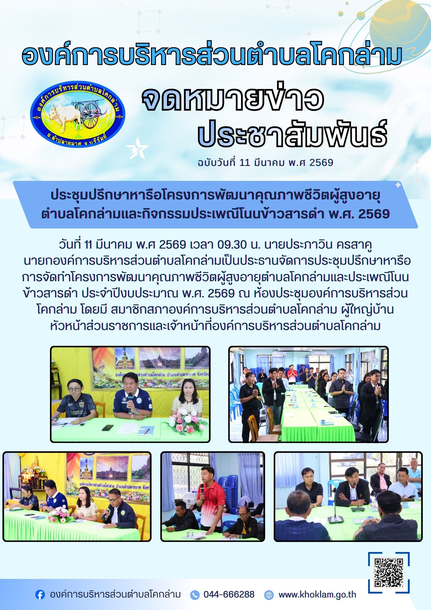 ประชุมปรึกษาหารือโครงการพัฒนาคุณภาพชีวิตผู้สูงอายุตำบลโคกล่ามและกิจกรรมประเพณีโนนข้าวสารดำ ประจำปีงบประมาณ 2569 วันที่ 11 มีนาคม พ.ศ 2569 เวลา 09.30 น. นายประภาวิน ครสาคูนายกองค์การบริหารส่วนตำบลโคกล่ามเป็นประธานจัดการประชุมปรึกษาหารือการจัดทำโครงการพัฒนาคุณภาพชีวิตผู้สูงอายุตำบลโคกล่ามและประเพณีโนน ข้าวสารดำ ประจำปีงบประมาณ พ.ศ. 2569 ณ ห้องประชุมองค์การบริหารส่วนโคกล่าม โดยมี สมาชิกสภาองค์การบริหารส่วนตำบลโคกล่าม ผู้ใหญ่บ้าน หัวหน้าส่วนราชการและเจ้าหน้าที่องค์การบริหารส่วนตำบลโคกล่าม